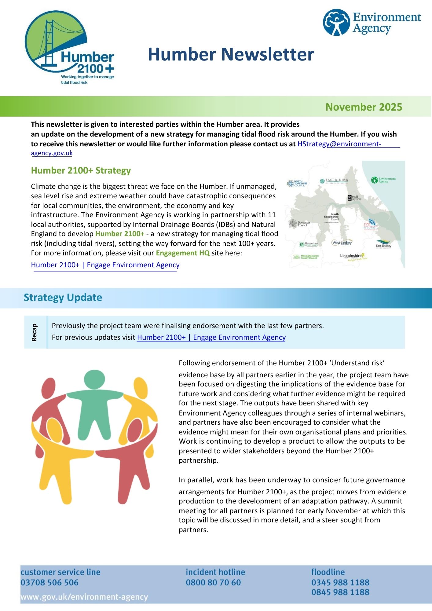 This newsletter provides an update on work the Environment Agency and partners are doing to develop a new strategy for managing tidal flood risk on and around the Humber and also lets you know about some key flood schemes/projects going on around the estuary.